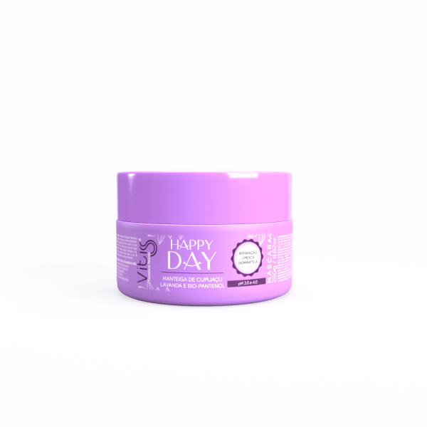 A Máscara Happy Day Vitiss proporciona reparação lipídica biomimética do couro cabeludo as pontas dos fios. É indicado para todos os tipos de cabelos. Enriquecida com Manteiga de cupuaçu, Lavanda e BIO-pantenol que fornecem resistência a quebra, hidratação extra, nutrição biomimética, vigor e reconstrução aos cabelos danificados.